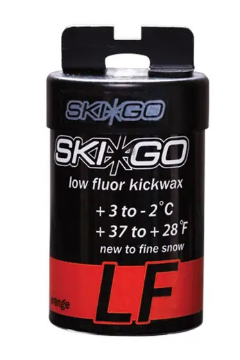 This orange 45g of low fluor kickwax for +3 till -2 C. For new to fine snow. Apply 4 layers across the kick zone.